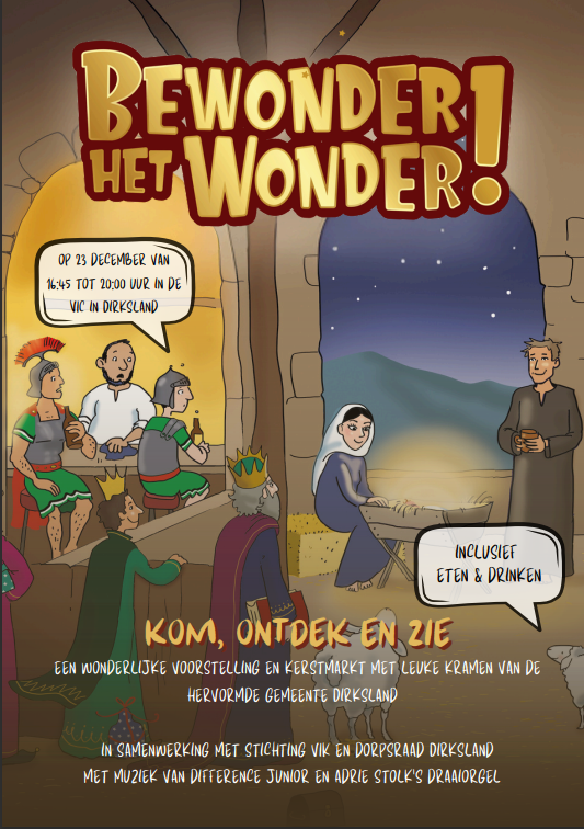 Dirksland – Op maandag 23 december is de Victoriahal in Dirksland ingericht als een sfeervolle plek vol warmte en verwondering. Van 16:45 tot 20:00 uur wordt hier de bijzondere kerstvoorstelling “Bewonder het Wonder” georganiseerd door de Hervormde Gemeente van Dirksland, in samenwerking met Stichting Verenigd in Kracht (SVIK) en de Dorpsraad Dirksland.